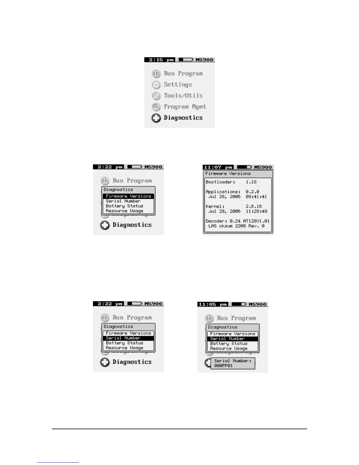The “Serial Number” function displays the information about the M5900 portable data