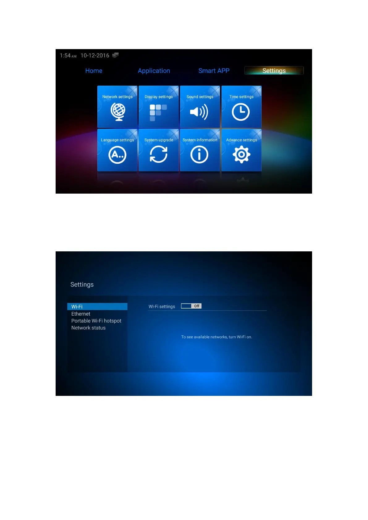 Click ”Network settings”, select Wi-Fi, click Wi-Fi settings button to on or off to open Wi-Fi or