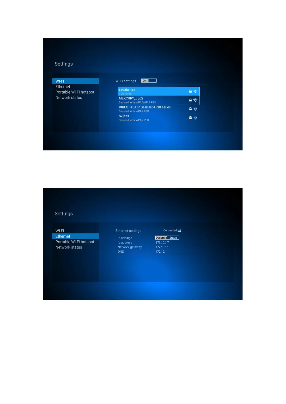 Click ”Network settings”, select Ethernet, if Dynamic IP, when plug Ethernet cable,