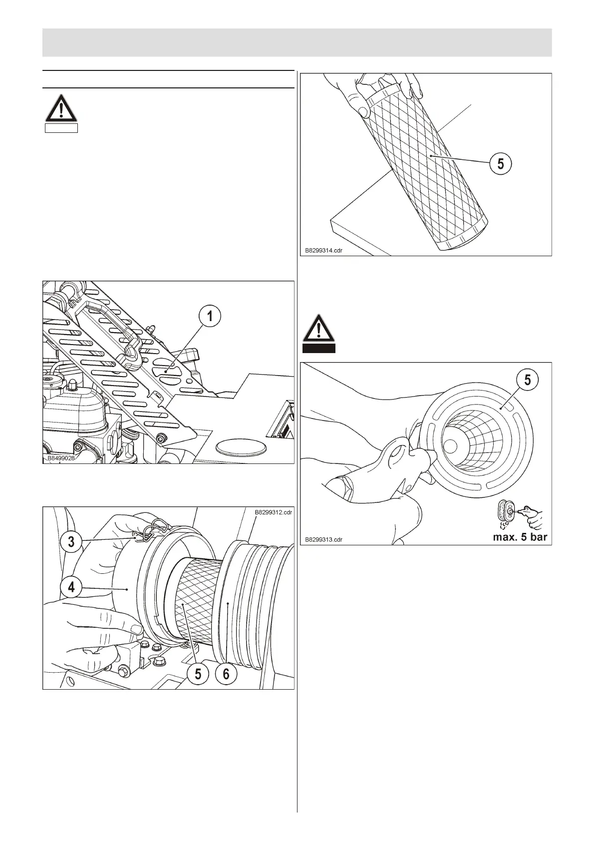• Fil ter pat ro ne (5) mit tro cke ner Druc kluft (max. 5 bar) von in -