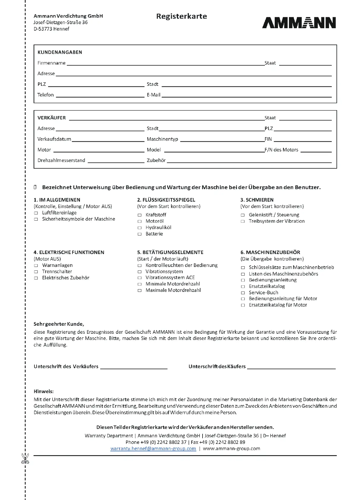 Ammann APH 50/75 - Re Gi Strier Kar Ten; Re Gi Stra Ti on Cards; Cards Denregistrement