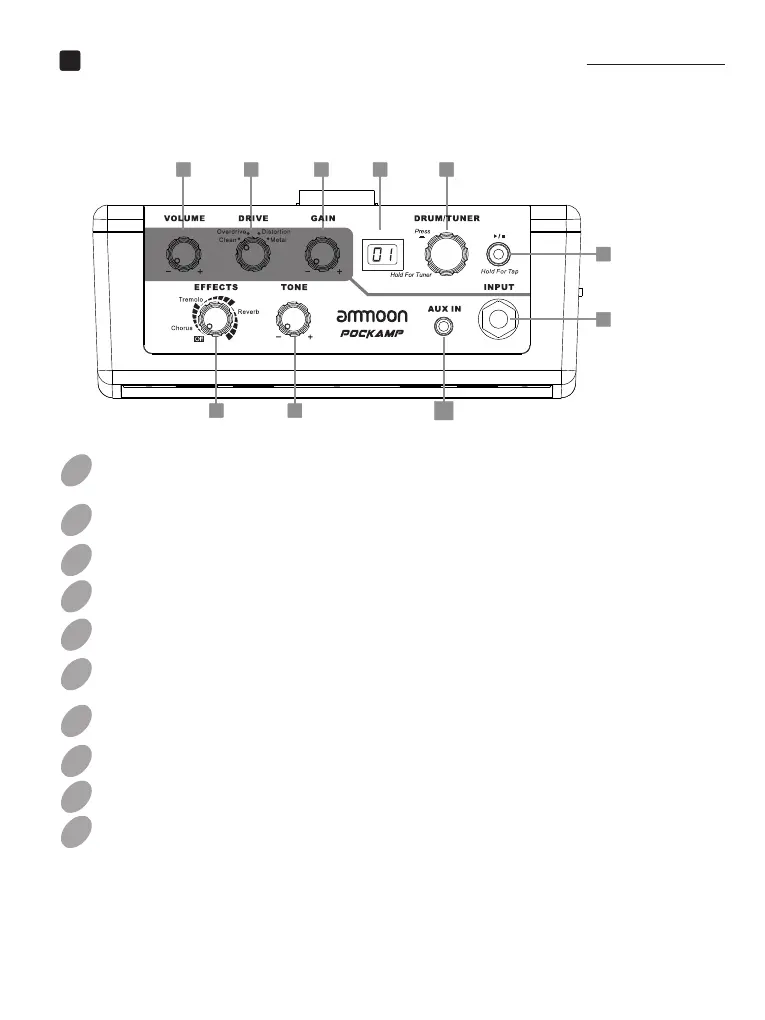 DRUM/TUNERButton: Press the button to switch between 3 Drum items.