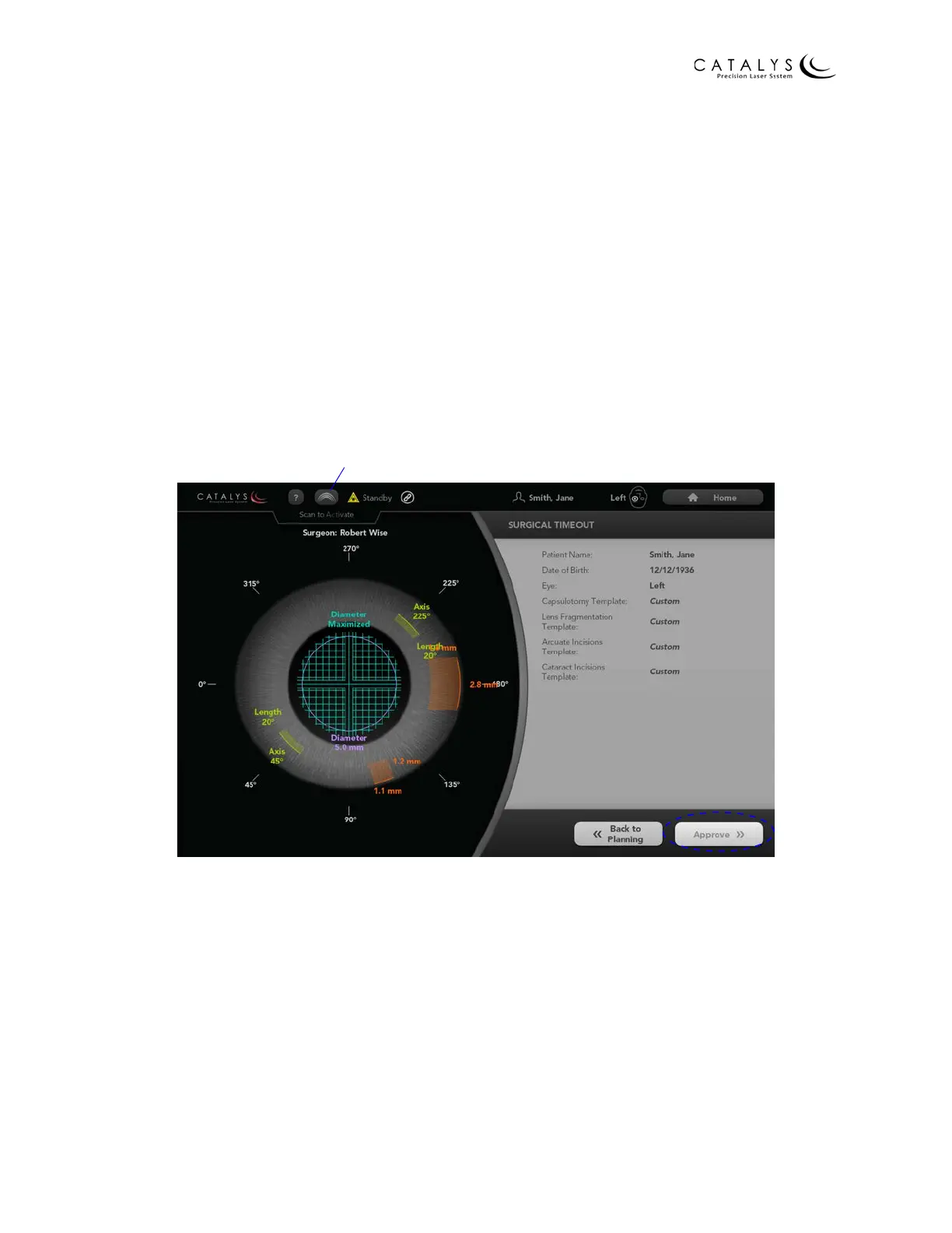 button on the Treatment Plan Summary Screen, the Surgical Timeout Screen displays. Verify that