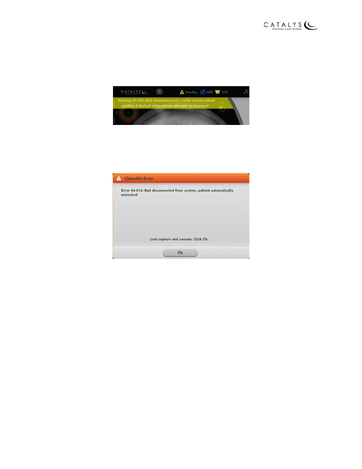 For additional information on CATALYS® System error codes, refer to System Error Codes, Faults,