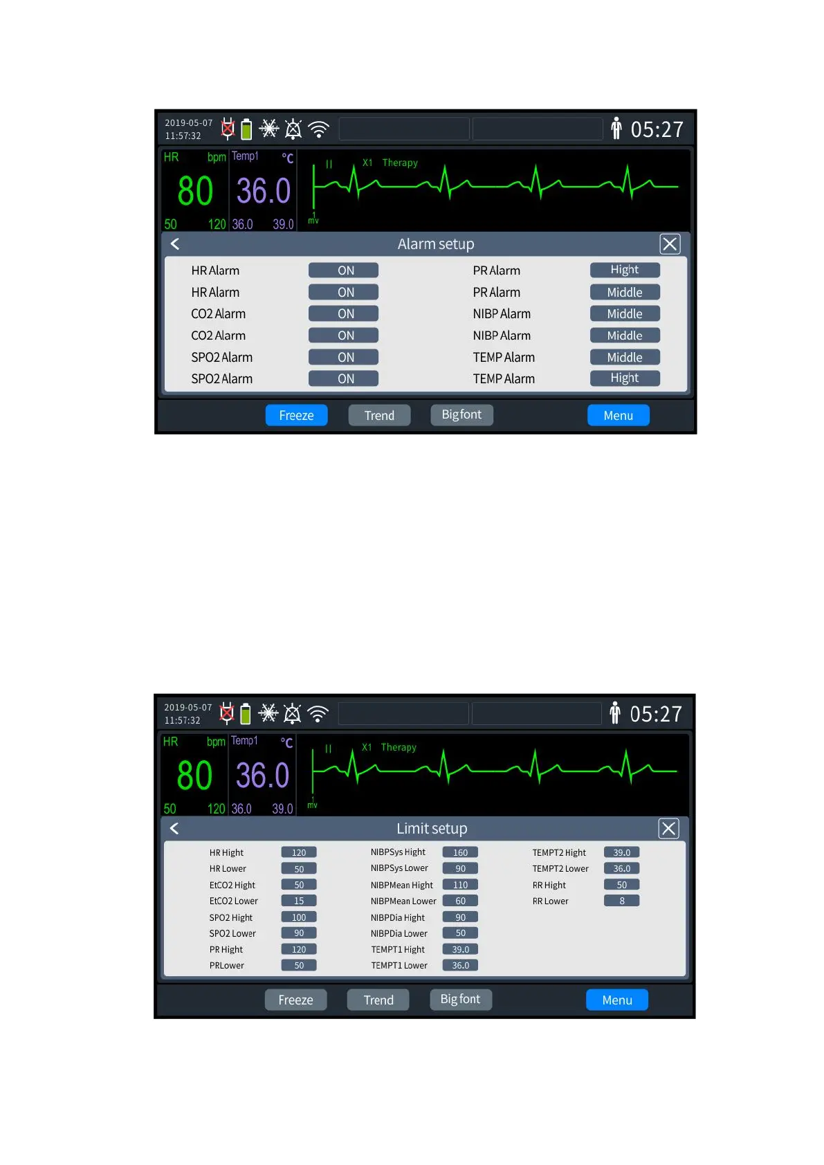 and the relevant vital parameter alarm level can be set to "High," "Med" and "Low". The alarm