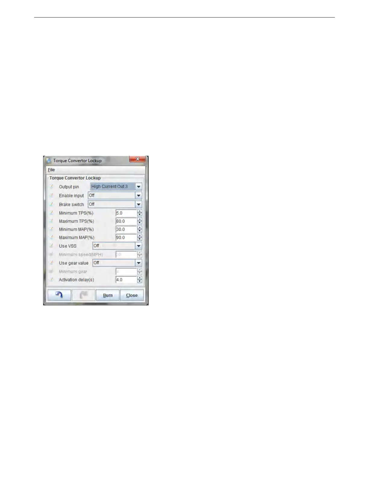 • Minimum speed - sets minimum speed for lockup. (Requires VSS input in speed/gear sensors.)