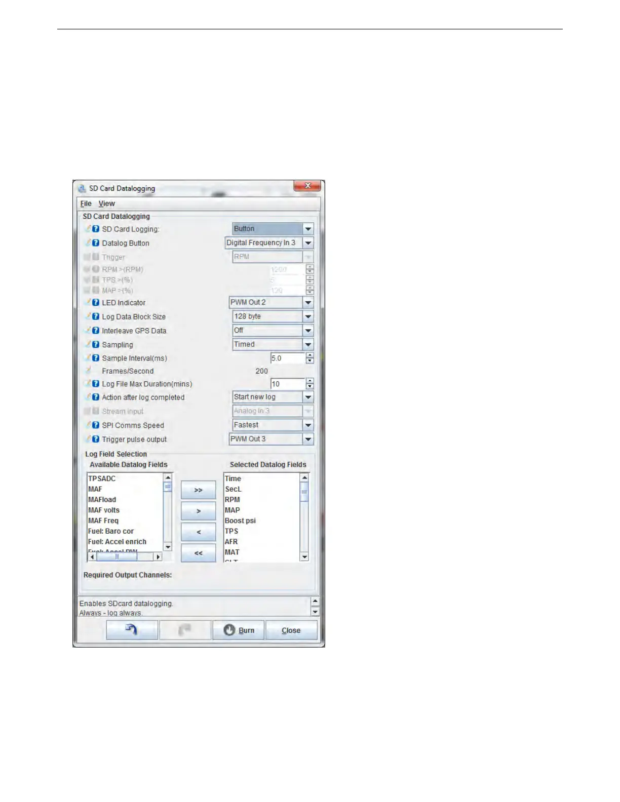 – Trigger - Logging is triggered by RPM or throttle position.