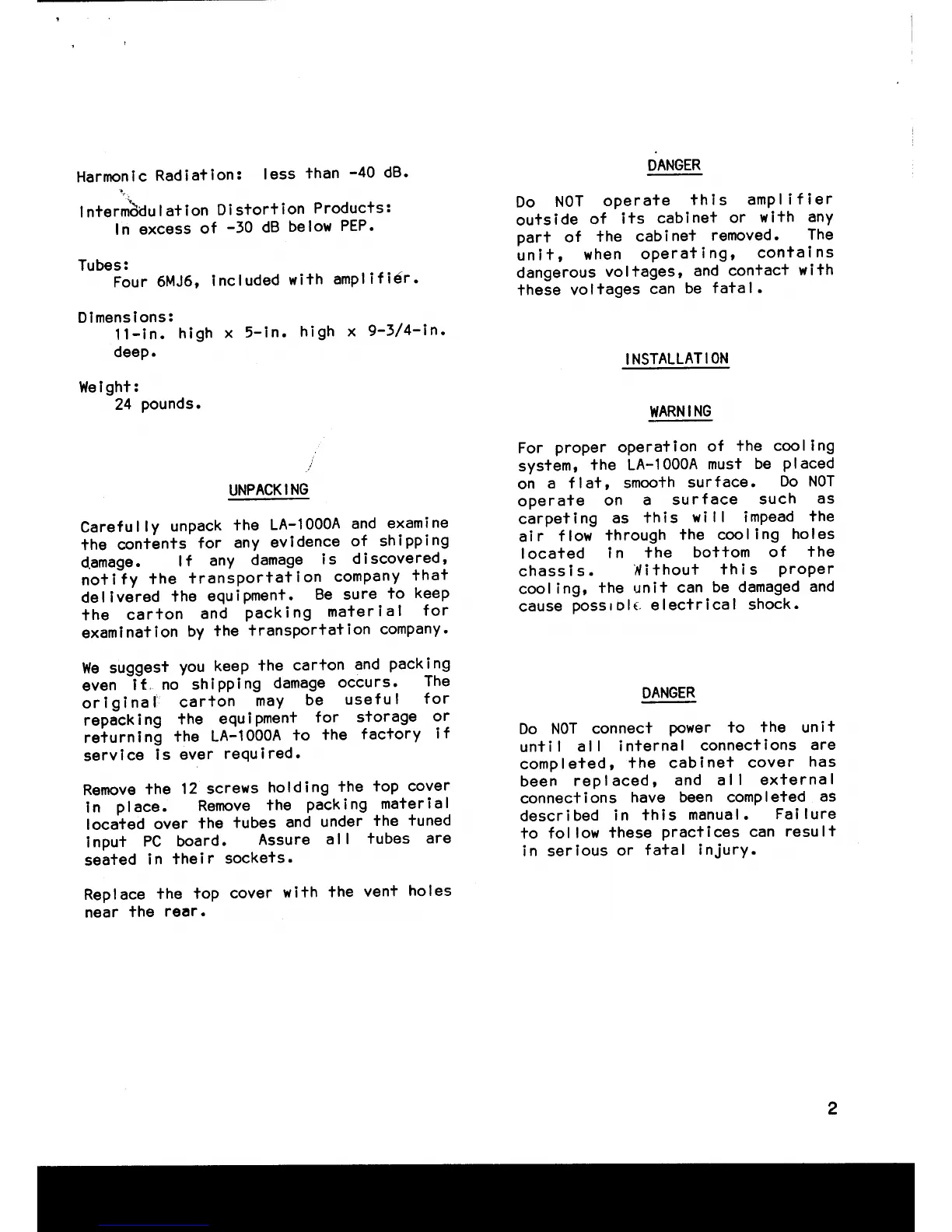 Amp Supply LA-1000A - Unpacking and Handling; Unpacking; Installation and Safety; Critical Safety Warnings