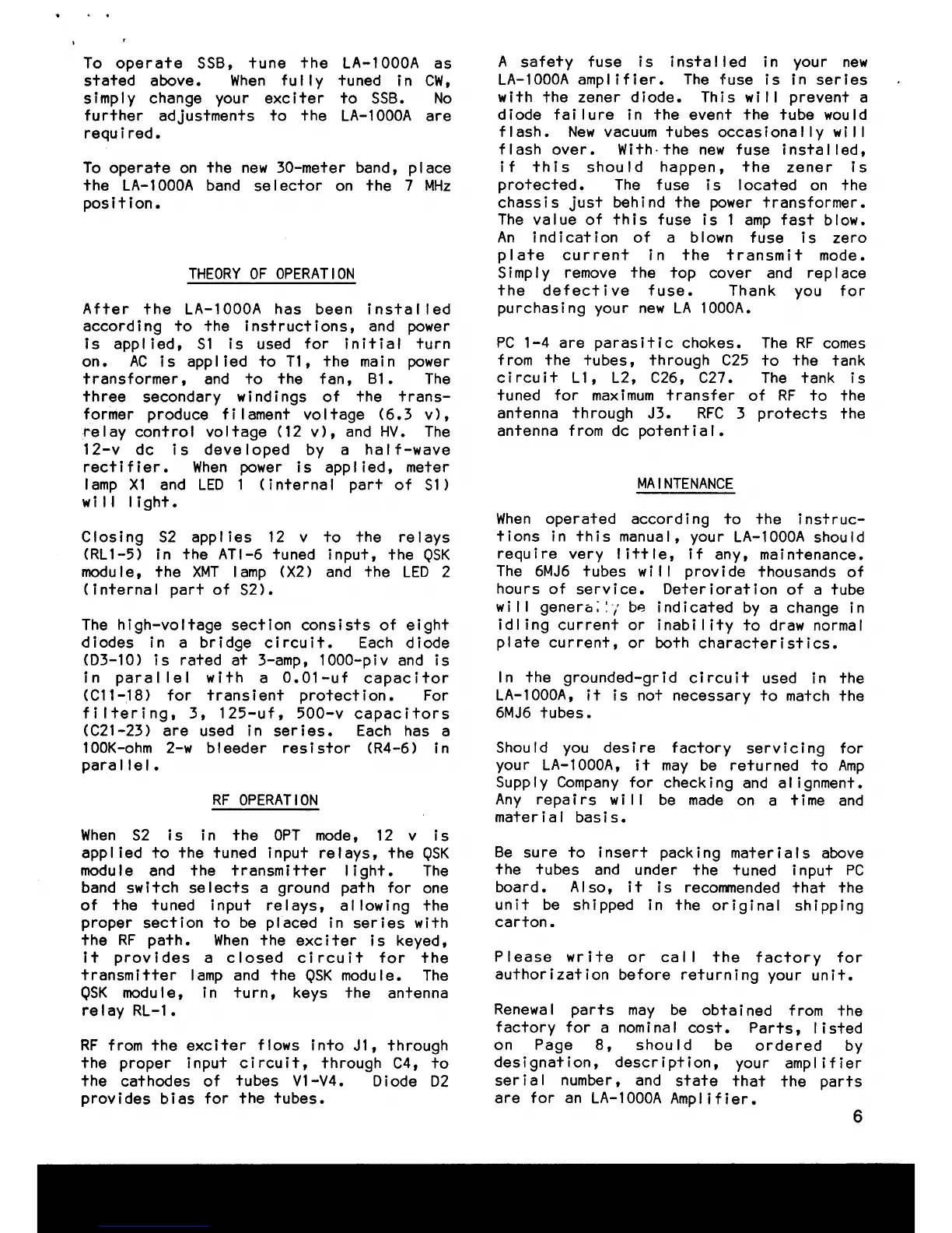 Amp Supply LA-1000A - Theory of Operation; RF Operation; Maintenance