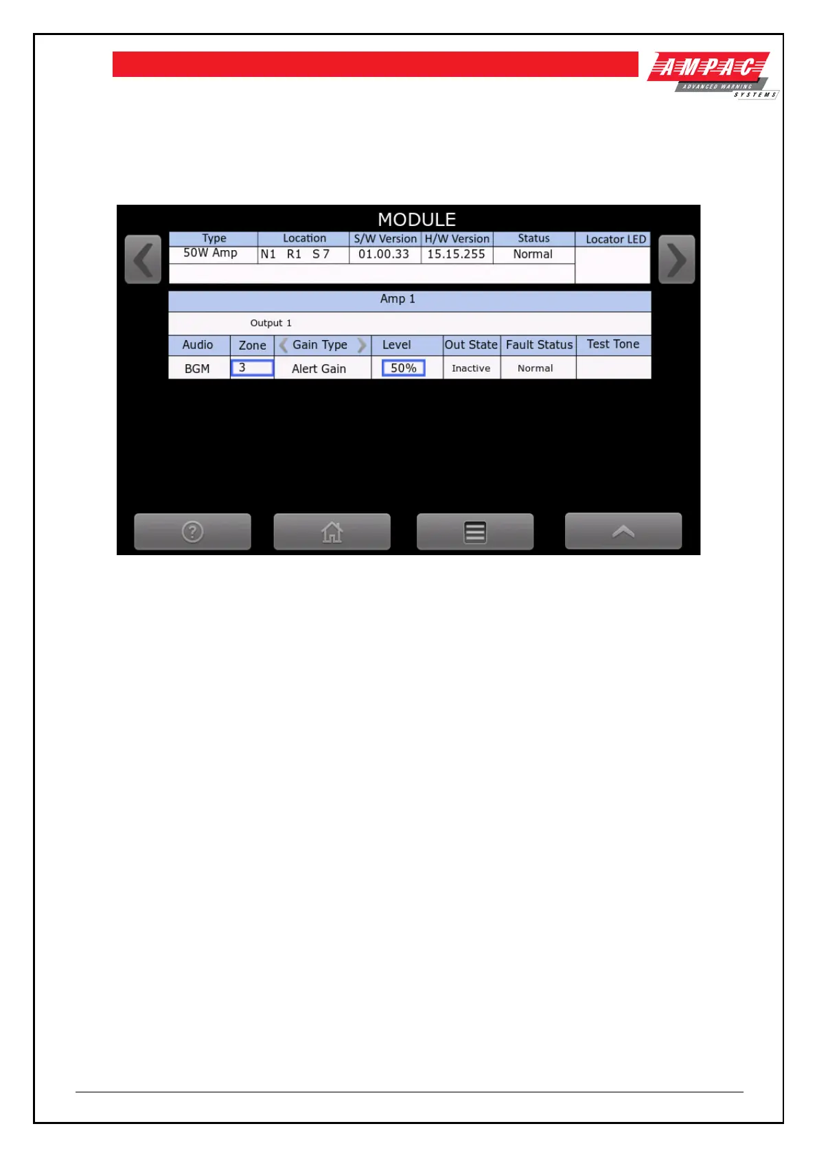 The 50-watt amplifier card supports 1x50 watt amplifier, refer to section 4.2.4.5. The status screen for the 50-