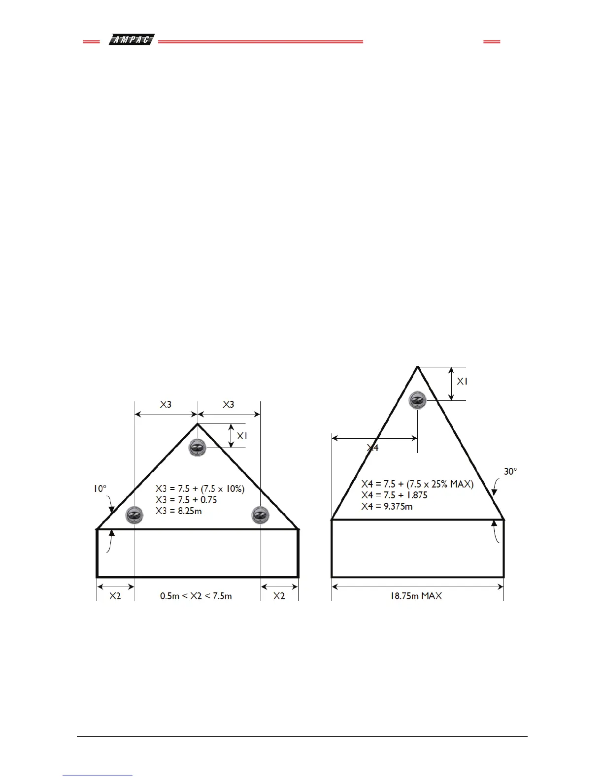 Pitch angles over 25° must use the maximum lateral figure of 9.375 metres either side of the infrared