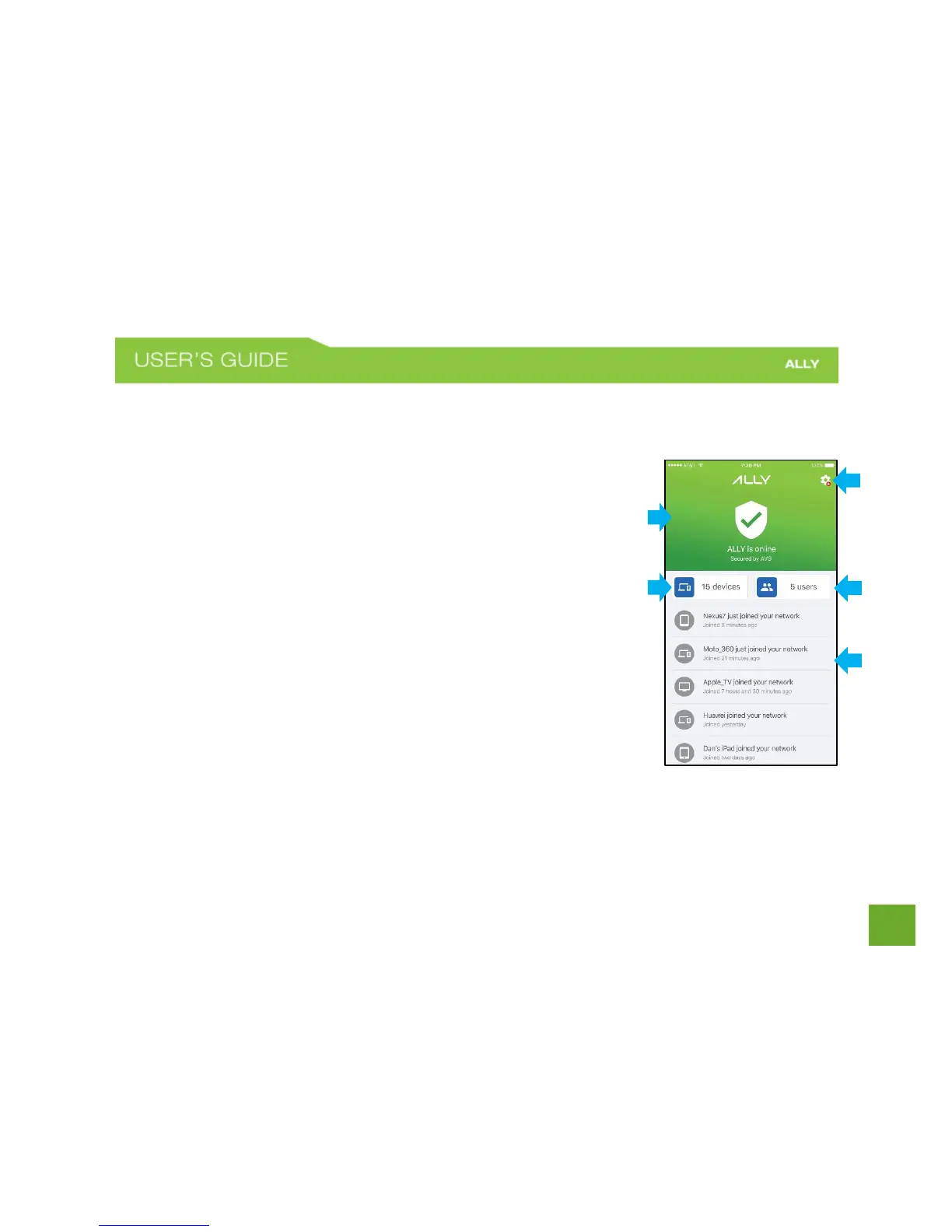 Home screen lets you see the status of your network and access all of ALLY’s