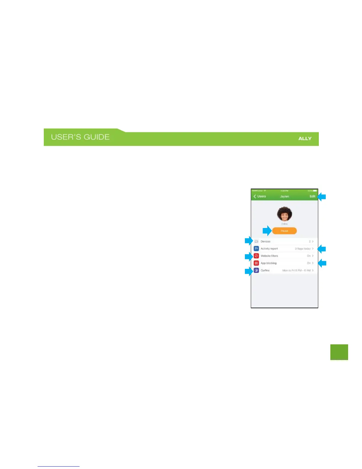 b) Pause button: Pause the Internet for the User and all of their associated