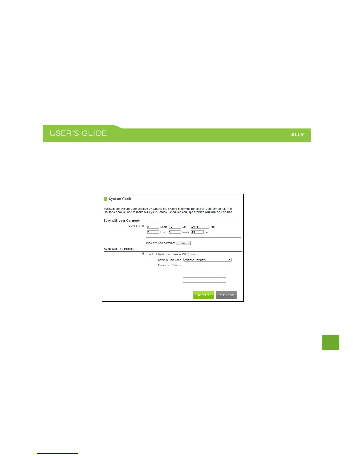 Maintain the internal clock for the Router by syncing with your computer’s time or over the Internet. Your