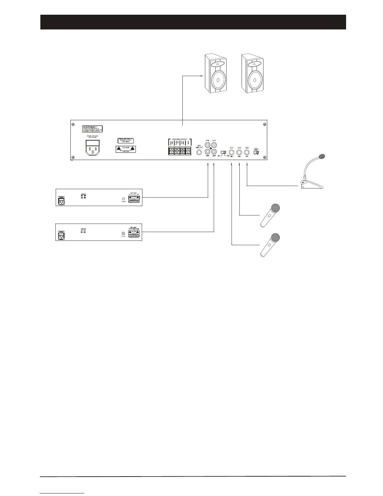 2. Speaker output connected to speakers with matching transformer (100V line out ) or without transformer