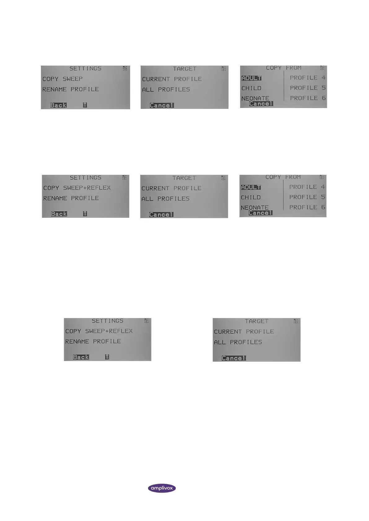 settings can be reset (e.g. only the tympanometry or only the reflex settings) or a complete profile with all its settings.