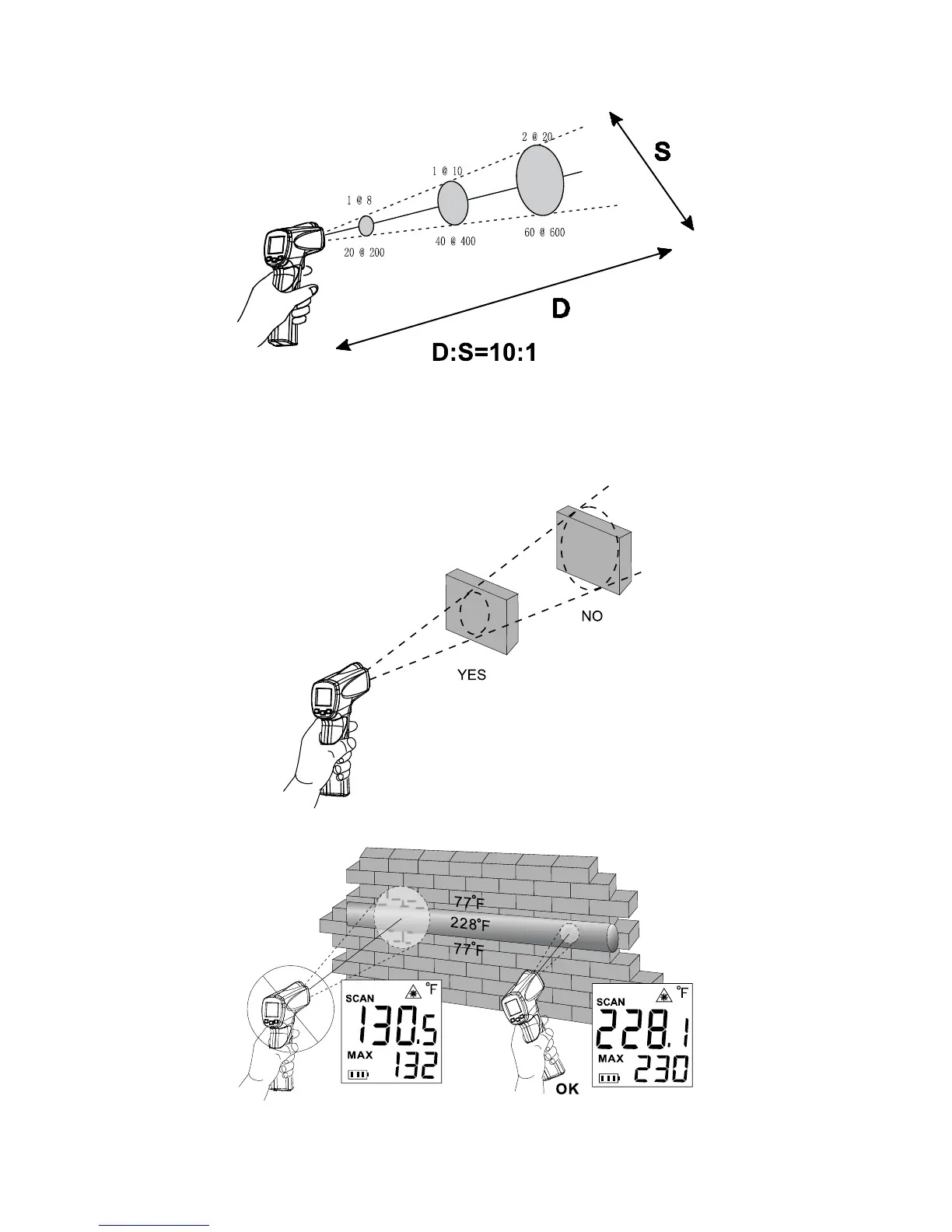 As the distance (D) from the target being measured increases, the spot size (S) of the area