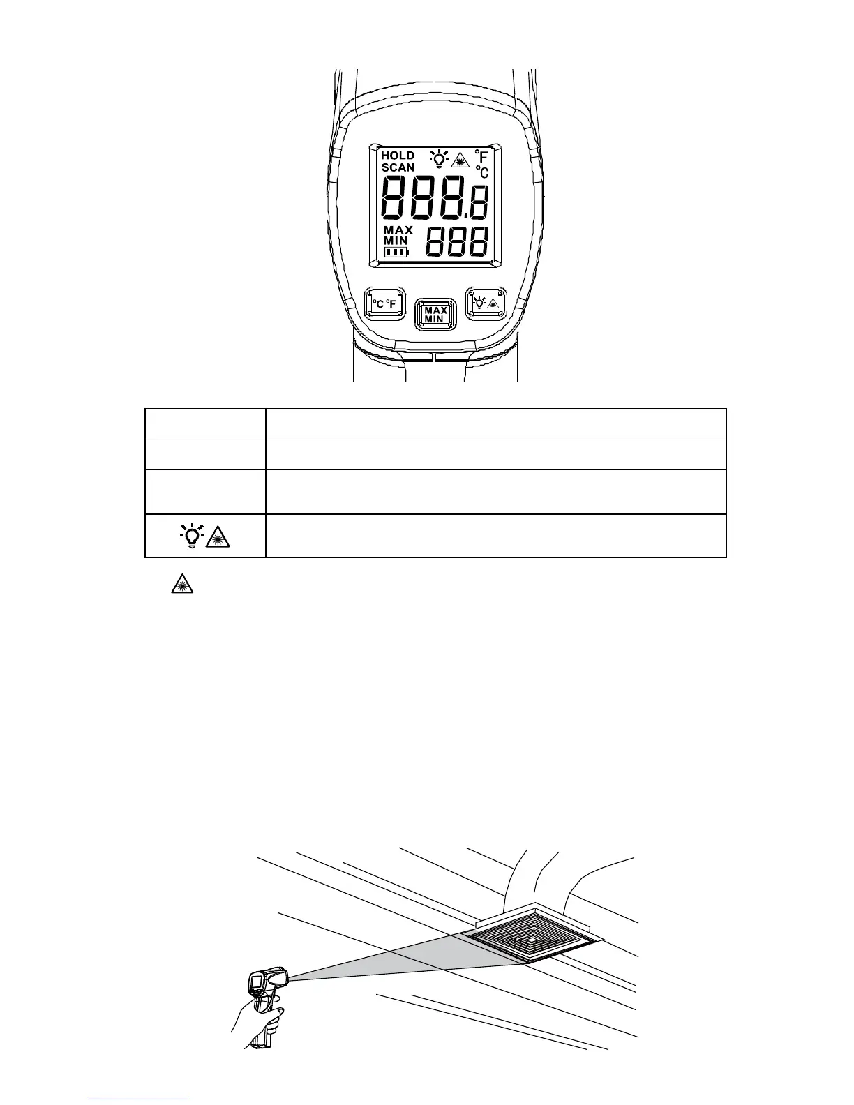 The thermometer is equipped with a laser used for aiming purposes only. The laser turns