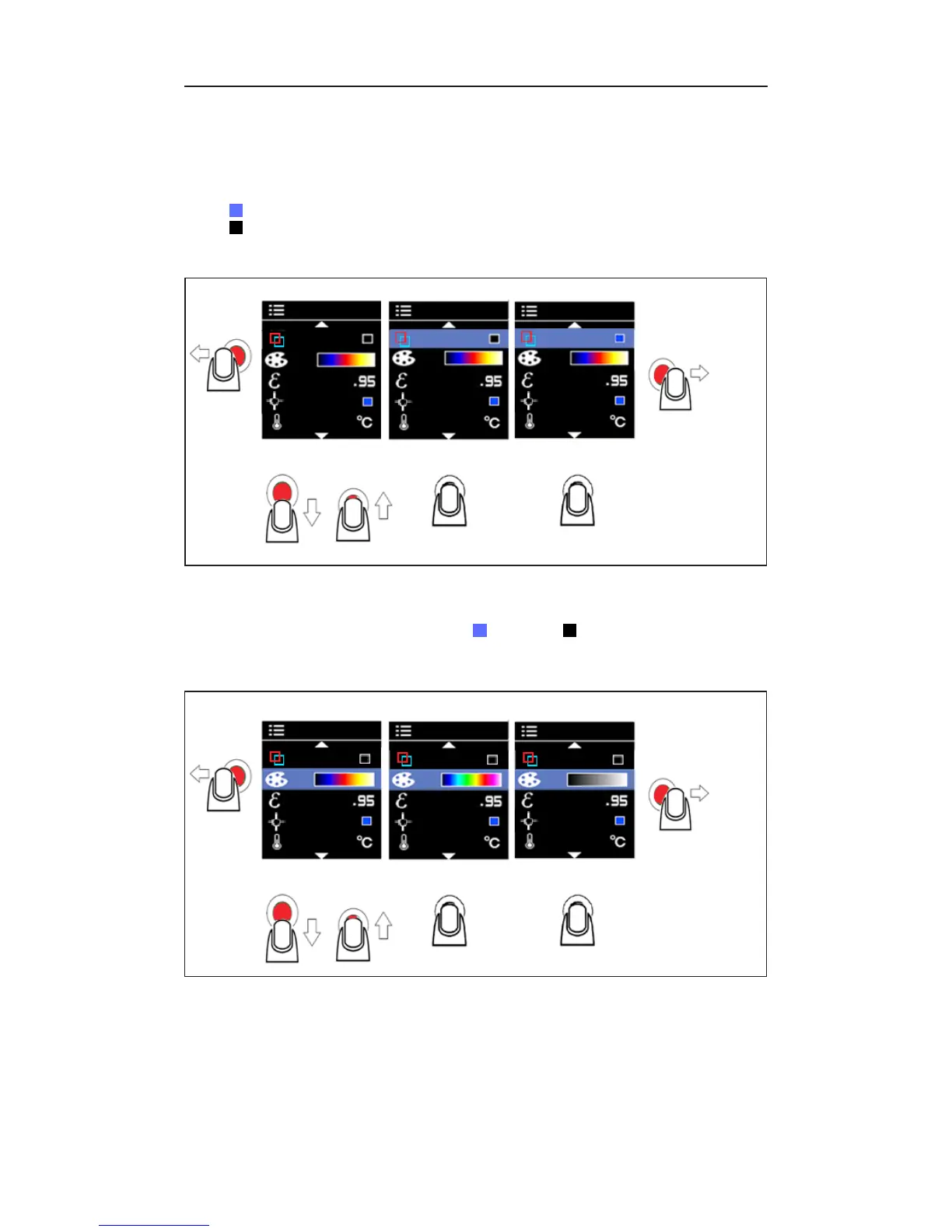 emisividad, el marcador de punto central, la opción de °C/°F seleccionable y
