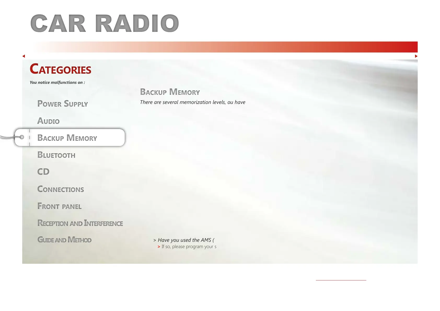 Memory maintenance : The pre-set stations on the memory buttons will be saved when the battery is disconnected.
