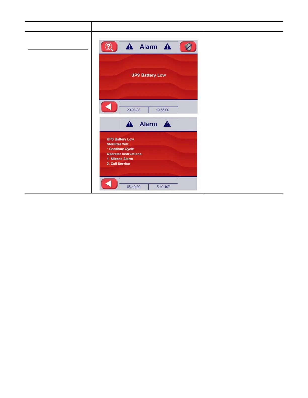 Alarm Screen UPS battery or UPS may be