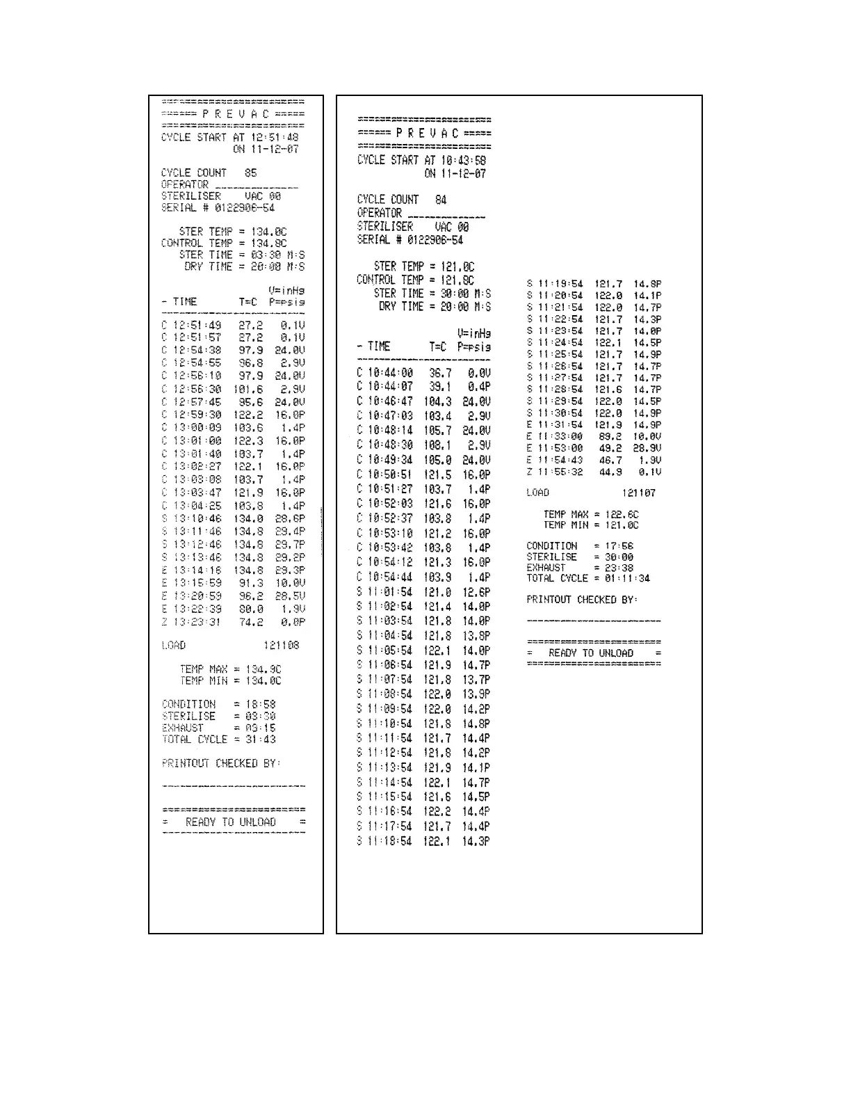 Figure 6-3. Prevacuum Cycle Printouts (134°C [273°F] and 121°C [250°F])