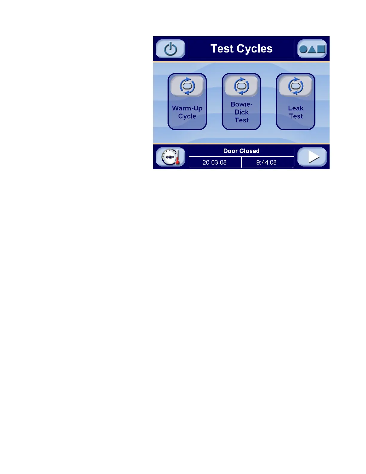 Press the desired test cycle button (warm-up cycle, Bowie-Dick test,