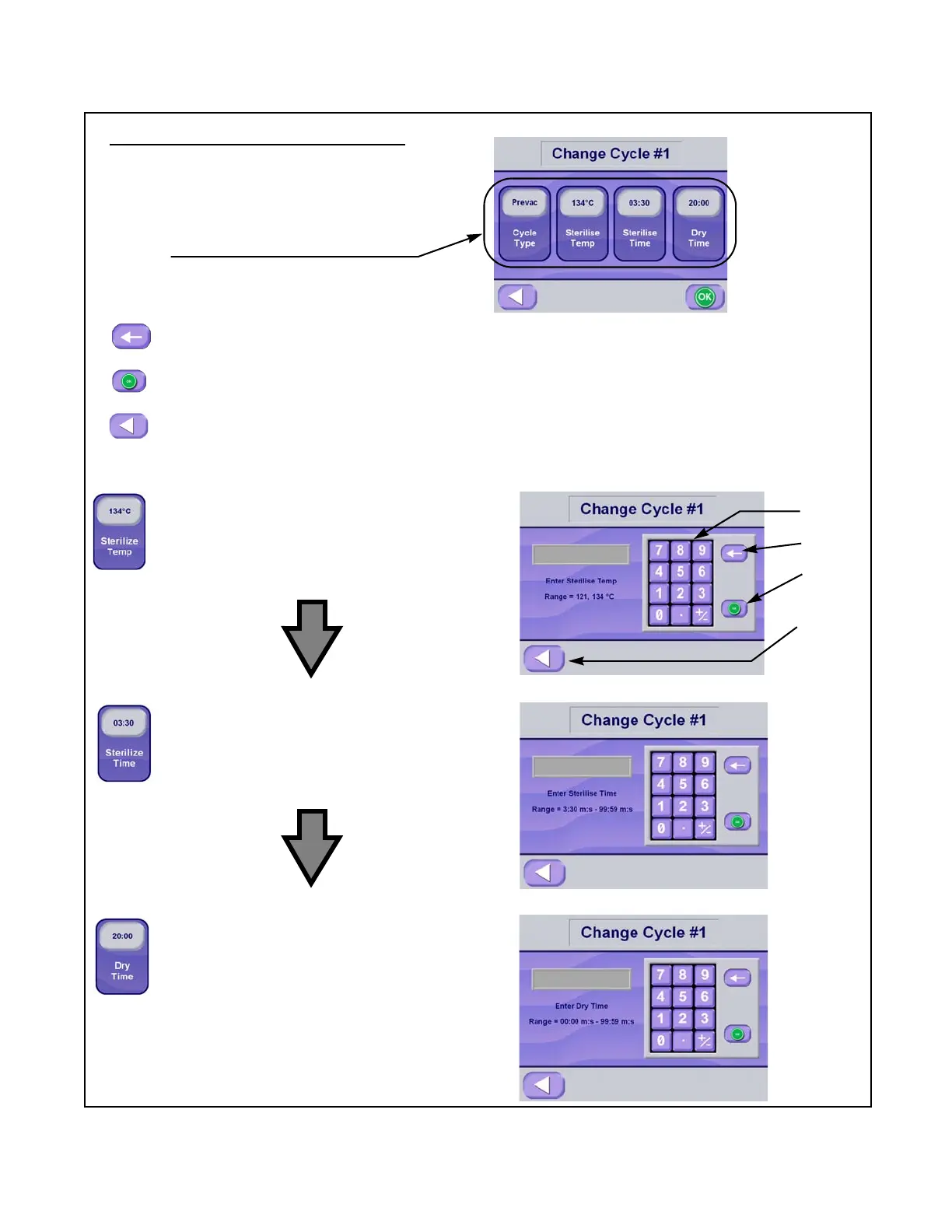 Press (OK) to accept values that have been entered, and return to change cycle