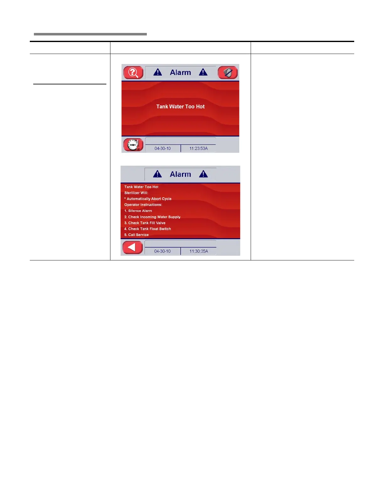 Condition Alarm Screen on Sterilizer Control Service Information