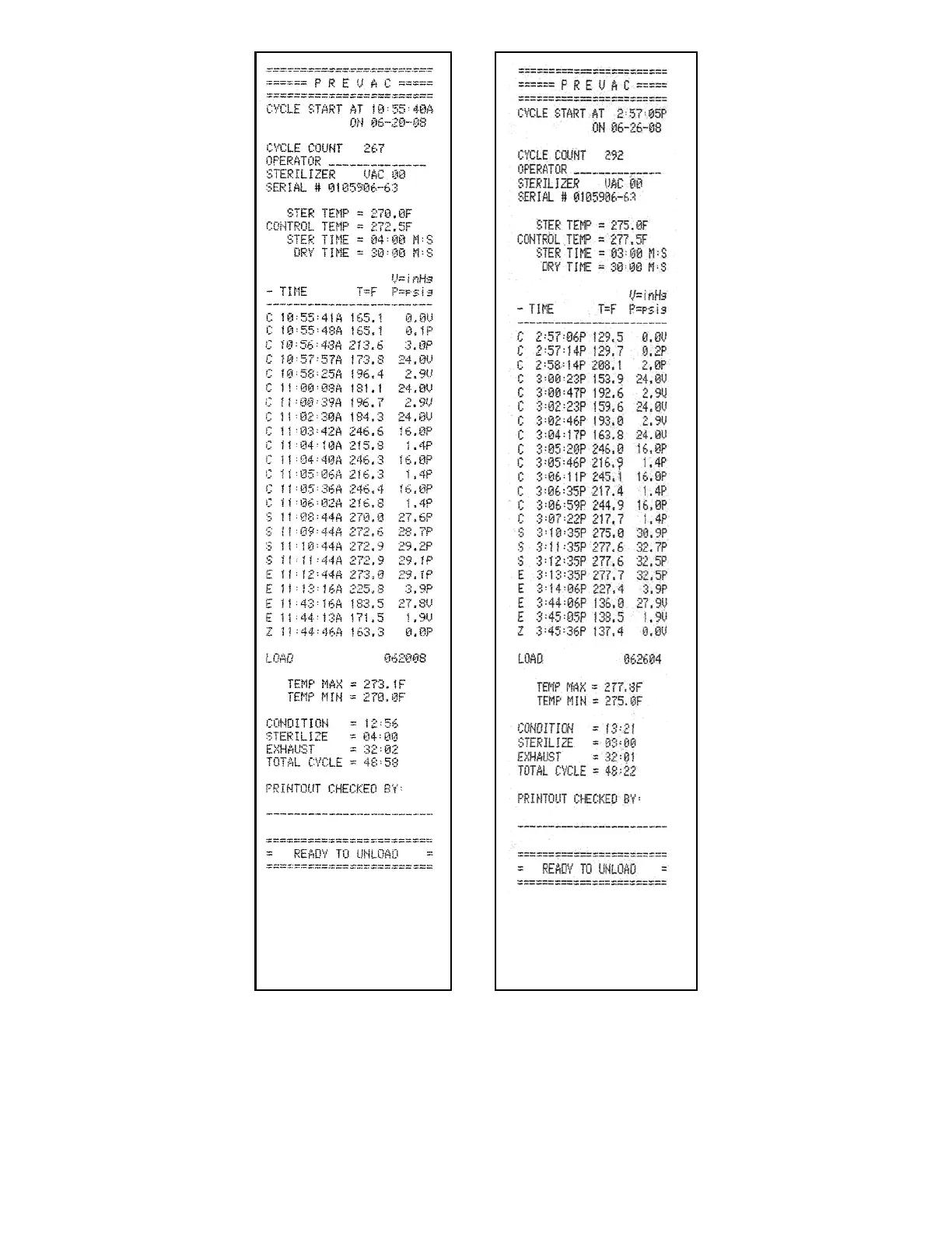 Figure 6-6. Prevacuum Cycle Printouts (270°F [132°C] and 275°F [135°C])