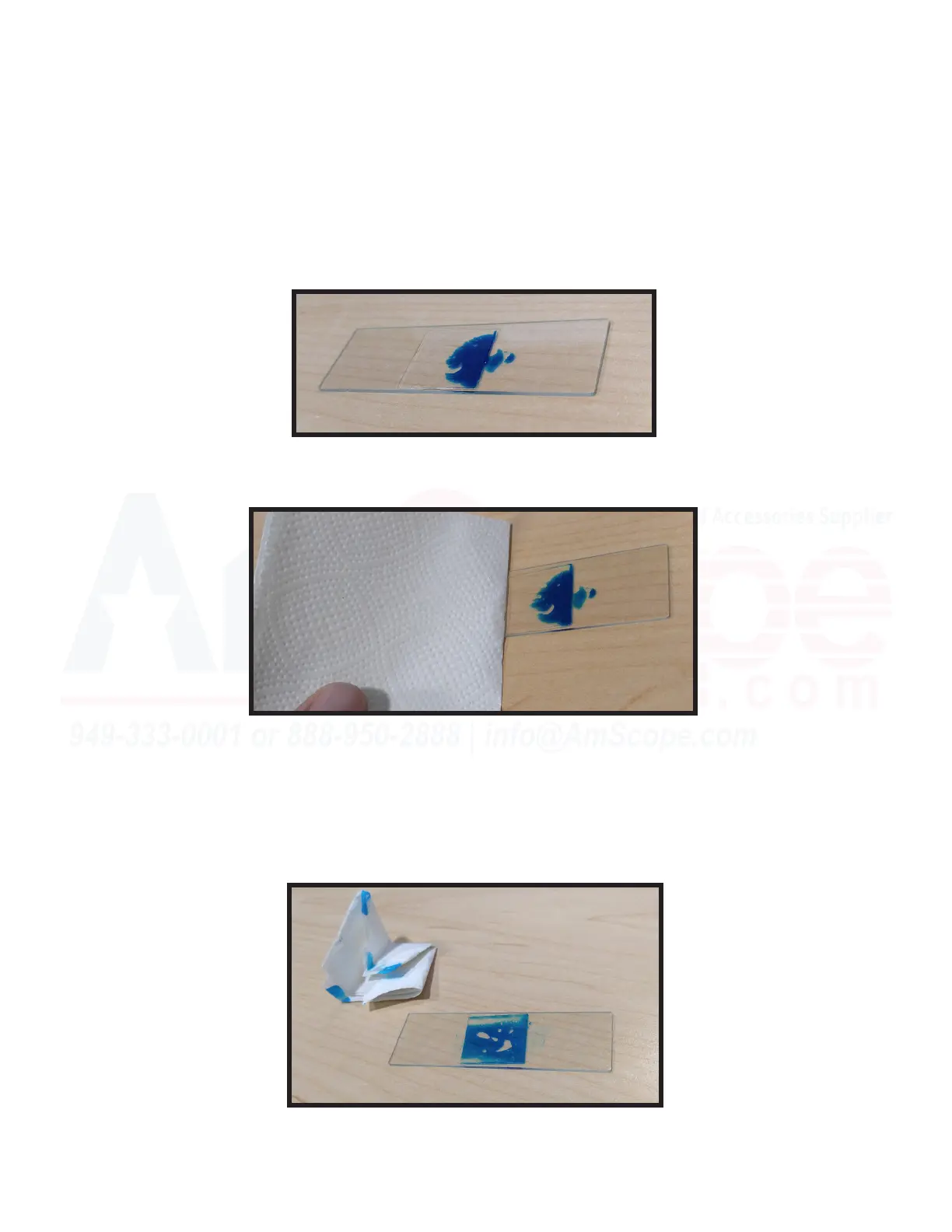 1. Place one drop of Methylene Blue (or other stain, sold separately) on one edge of the cover slip, and place the