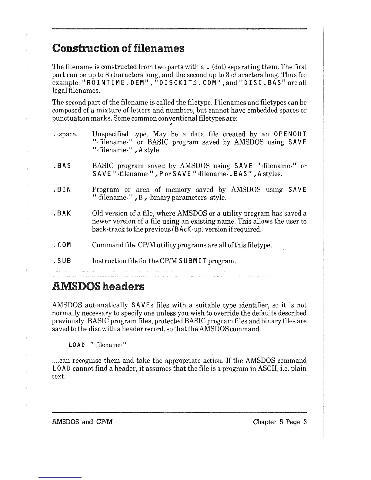 AMSTRAD cpc 6128 - Construction of Filenames; Amsdos Headers