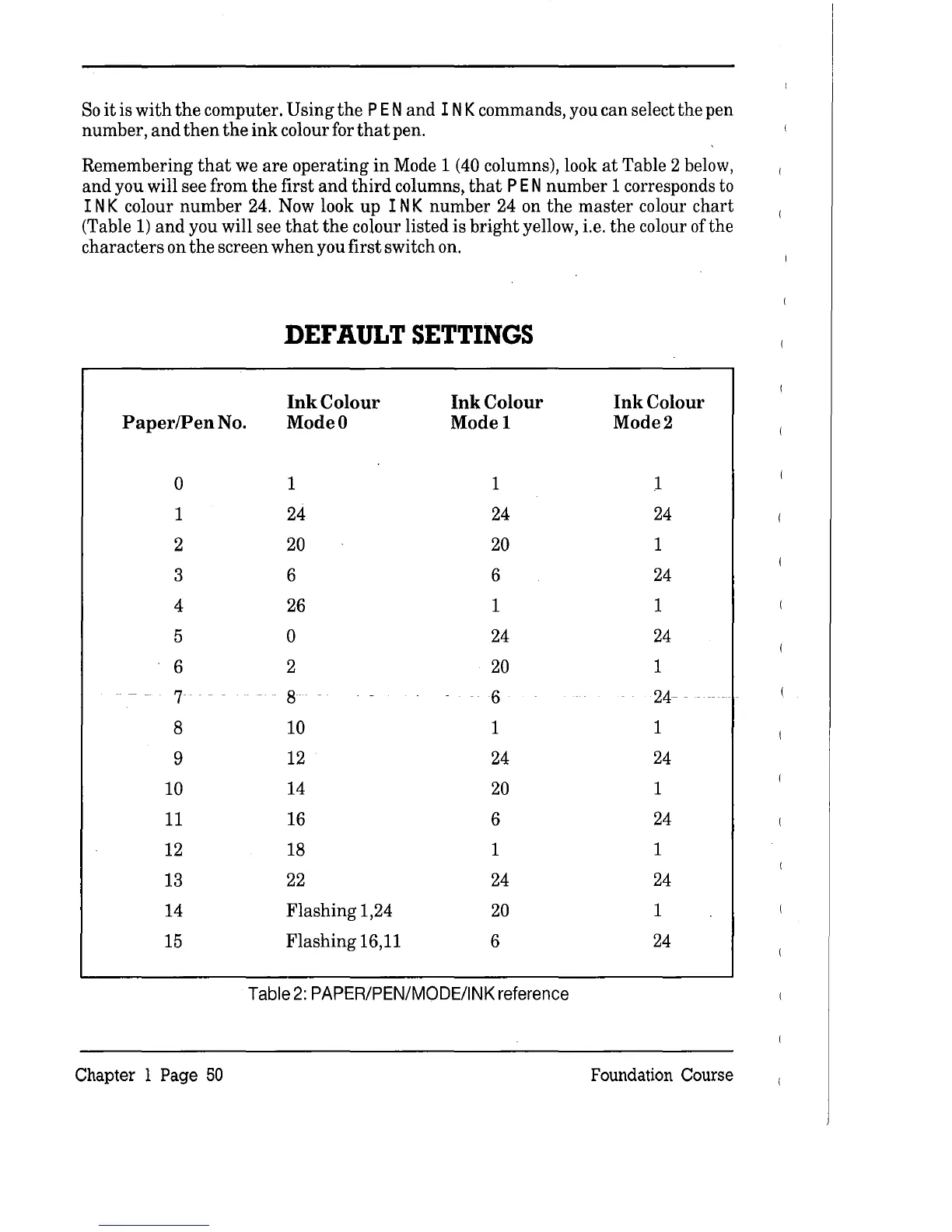 AMSTRAD cpc 6128 - Default Settings; Paper;Pen;Mode;Ink Reference