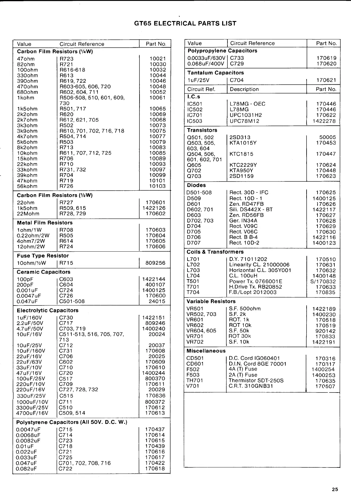 AMSTRAD GT65 - GT65 Electrical Parts List