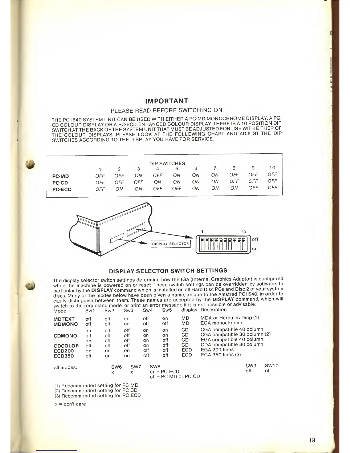 AMSTRAD PC1640 - Display Selector Switch Settings; Before Switching on