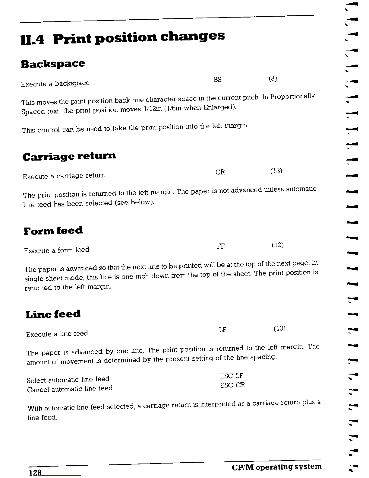 AMSTRAD PCW8256 - Print Position Changes; Backspace; Carriage Return; Form Feed