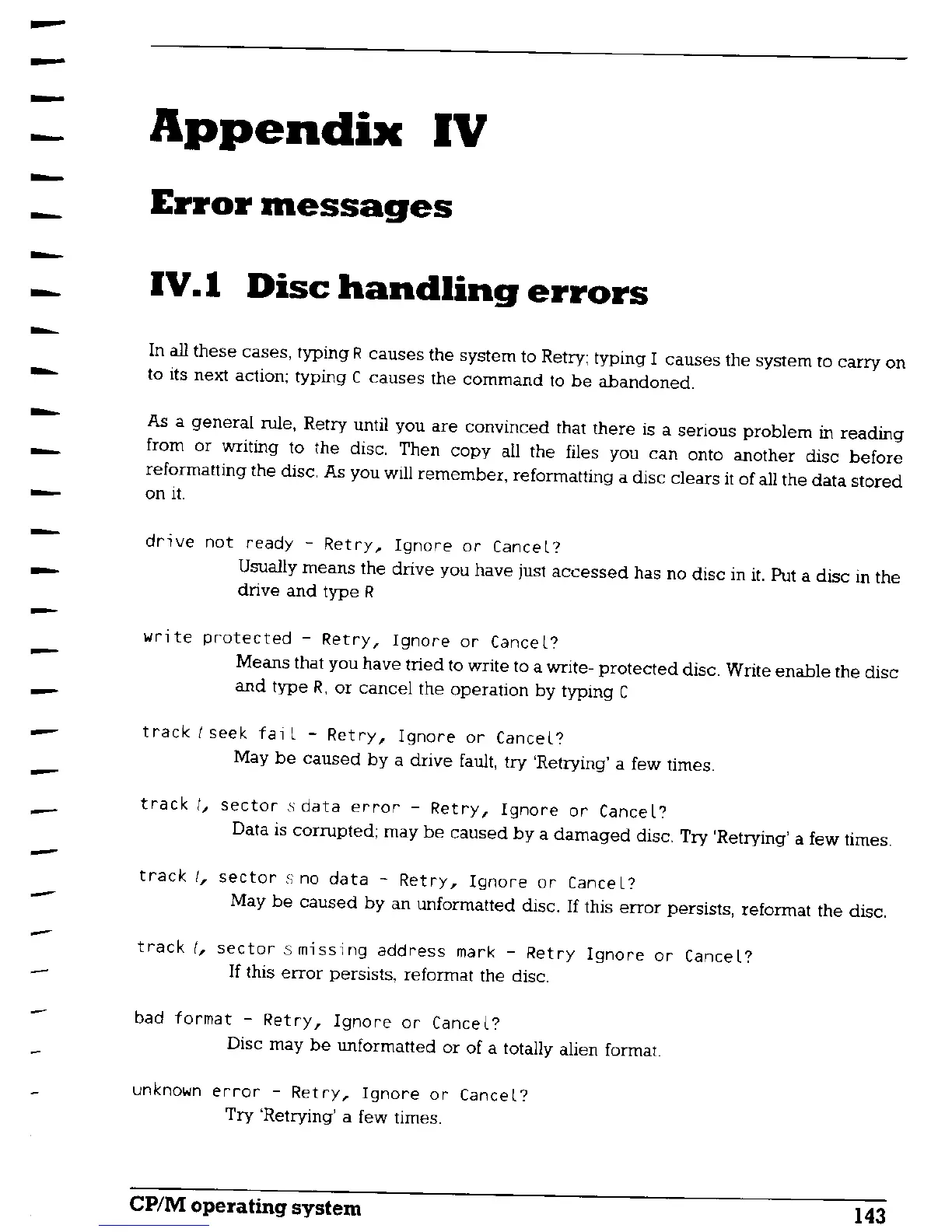 AMSTRAD PCW8256 - Error Messages; Disc Handling Errors