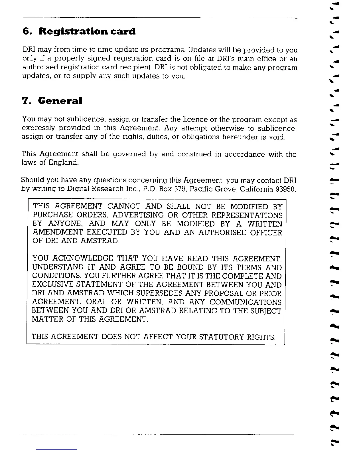 AMSTRAD PCW8256 - Registration Card; General Licence Provisions