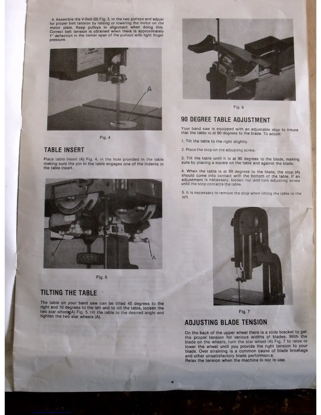 AMT 4113 - Table Insert Installation; 90 Degree Table Adjustment; Tilting the Table; Adjusting Blade Tension