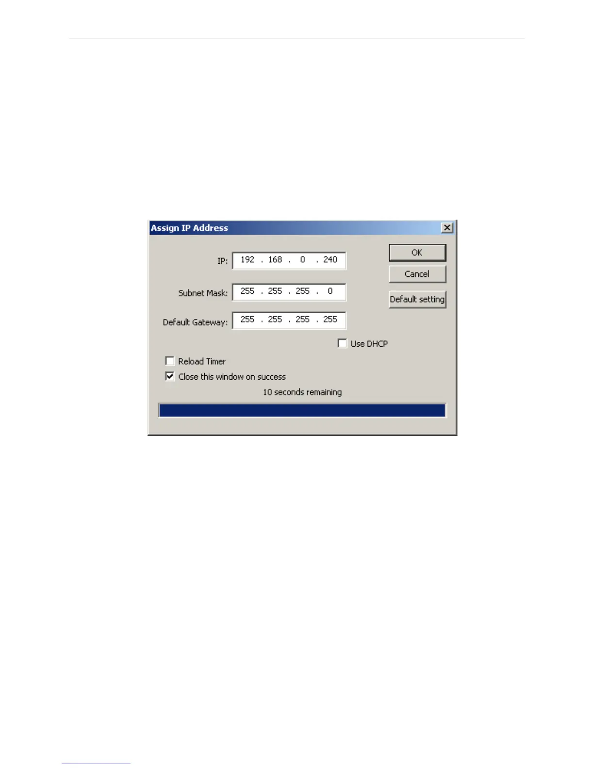 “Default Gateway”. If there is no gateway in the network, fill 255.255.255.255 in the “Default