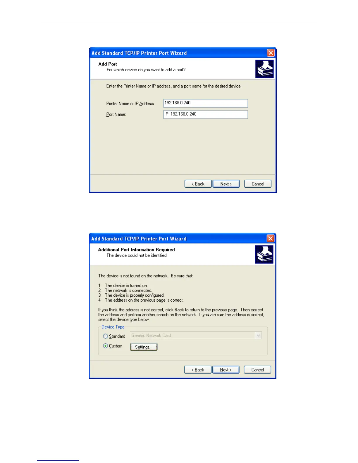 7) Come out a window of “Additional Port Information Required”, select “Custom” in the “Device