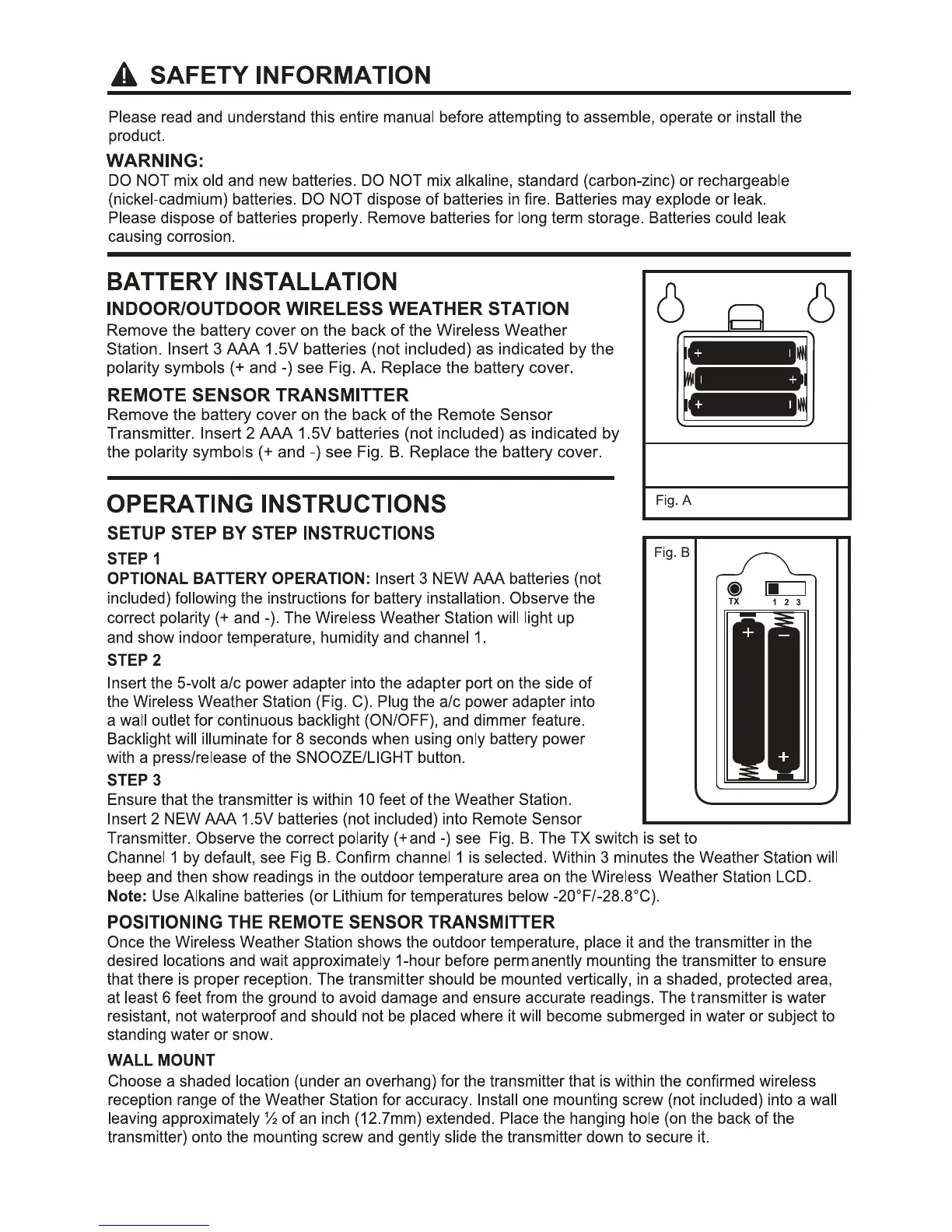 AMTAST AW005 - Safety Information; Battery Installation; Operating Instructions; Setup Steps