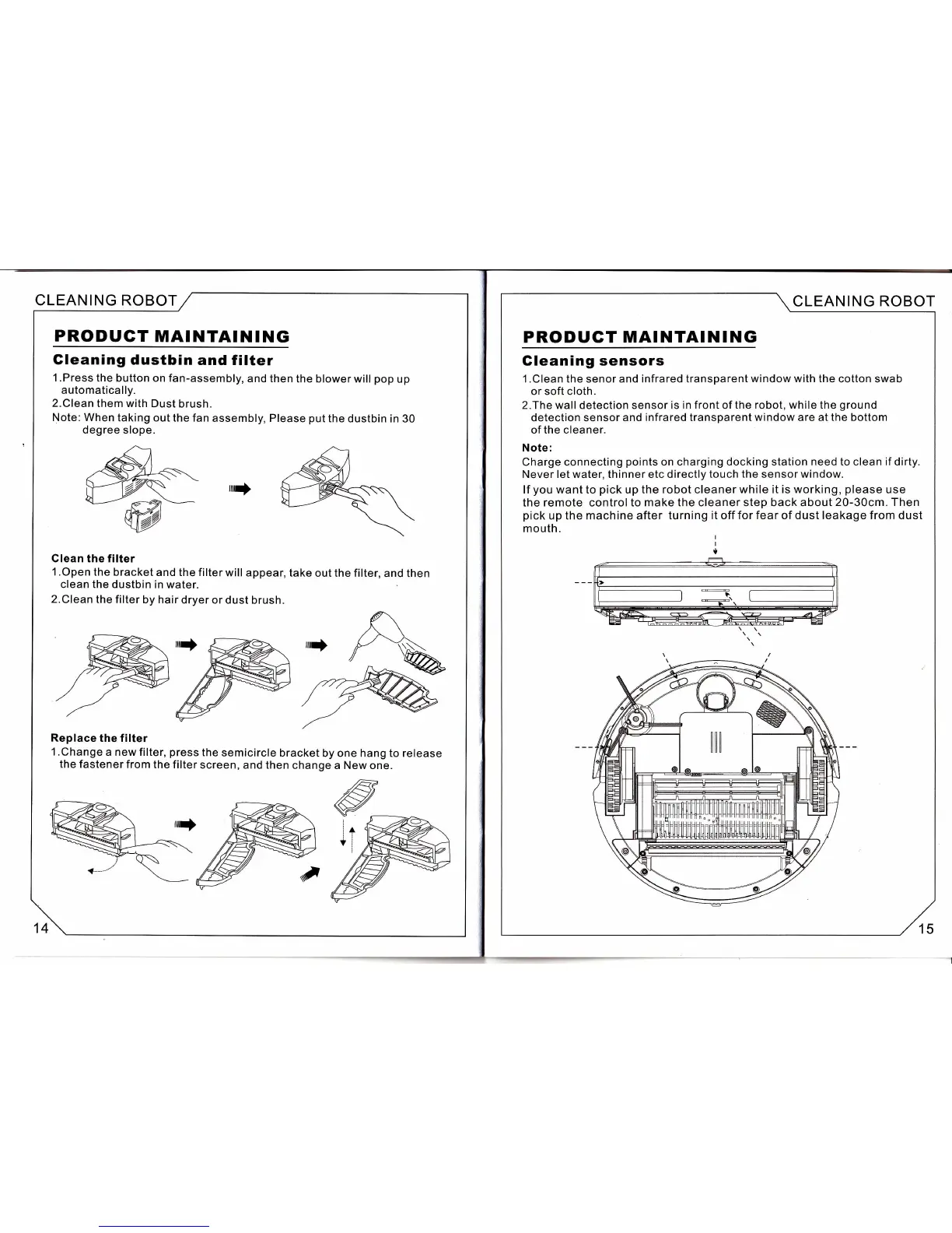 AmTidy A325 - PRODUCT MAINTAINING - Dustbin, Filter, and Sensors; Dustbin and Filter Cleaning; Sensor Cleaning and Maintenance