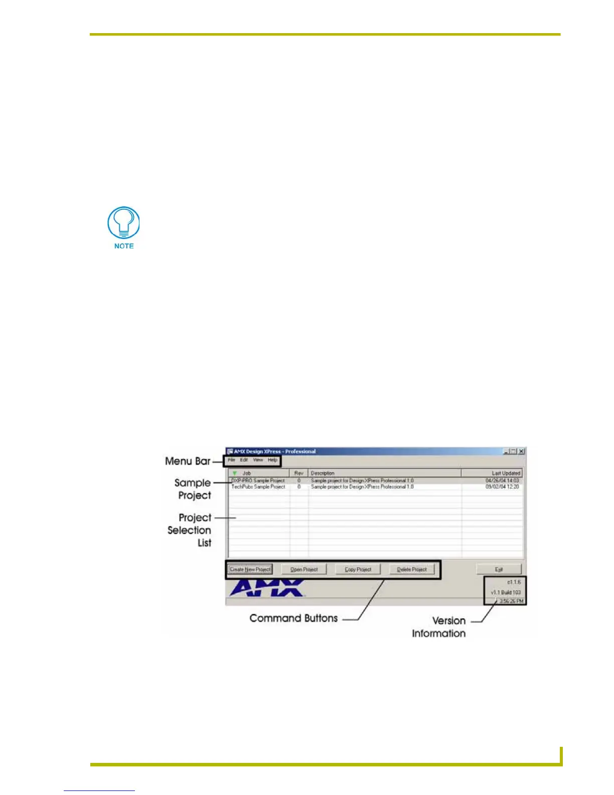 There are three main areas on the Main Screen: the Menu Bar, the Project Selection List, and the