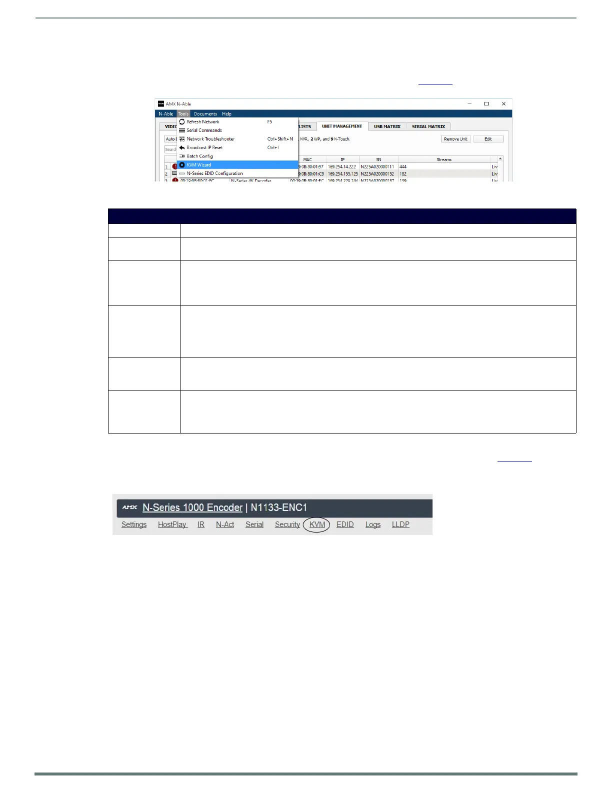 Use the KVM Encoders table (on the Decoder’s KVM page) to:
