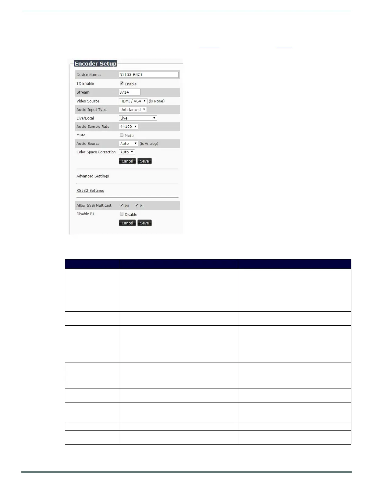The Encoder Setup section of the Settings page is shown in Figure 23. Options are described in Table 1.