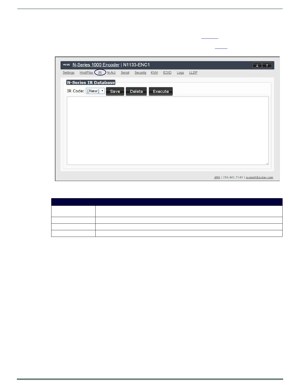 saved for future use and executed later. The IR Code menu lists all saved IR commands. See Ta b le 8