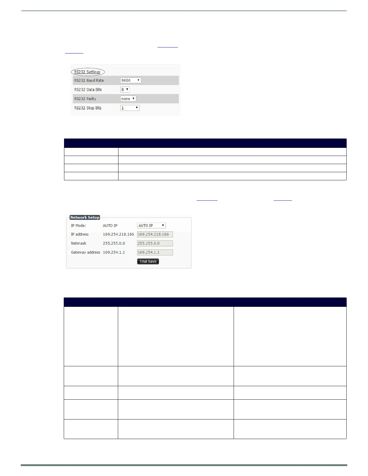 The section of the Settings page shown in Figure 43 is displayed when you click the RS232 Settings link. Options are described in