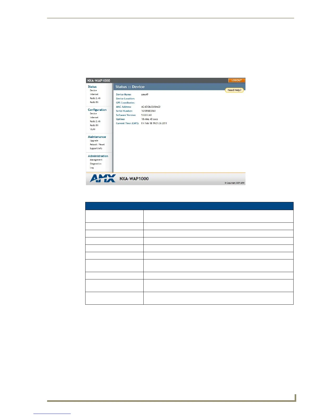 The Status section of the Menu displays the current status and availability of the NXA-WAP1000.