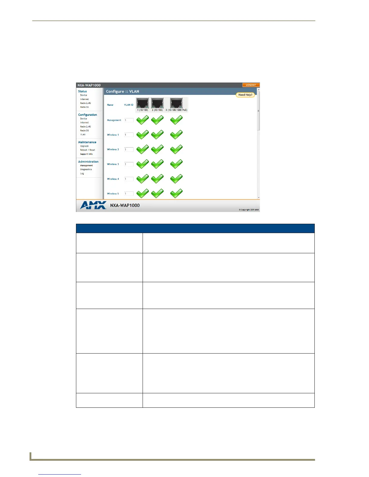 The VLAN page (FIG. 20) is used to configure the virtual LAN (VLAN) parameters of the AP. Traffic never